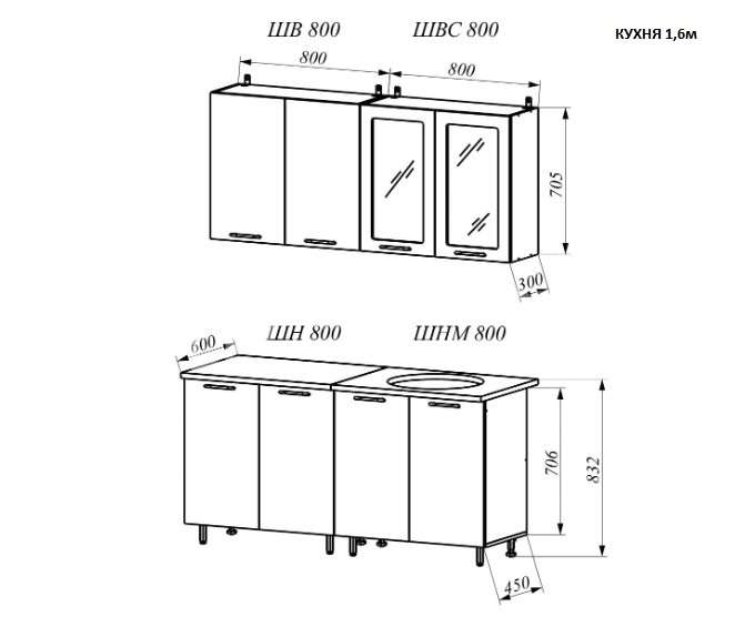 Можно заказать кухню размером 1,6м №2 где стол ШН800 -1 дверь/ ящики и шкаф 800 со стеклом, можно выполнить с глухим фасадом.