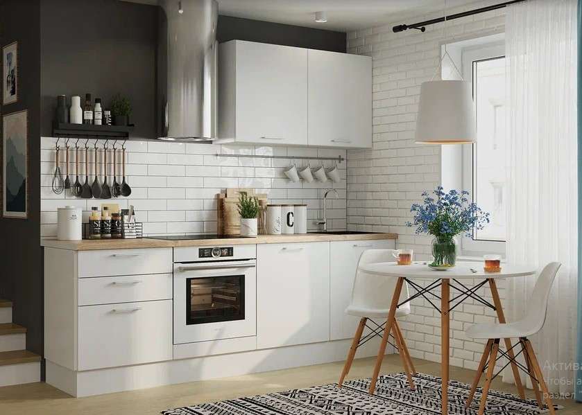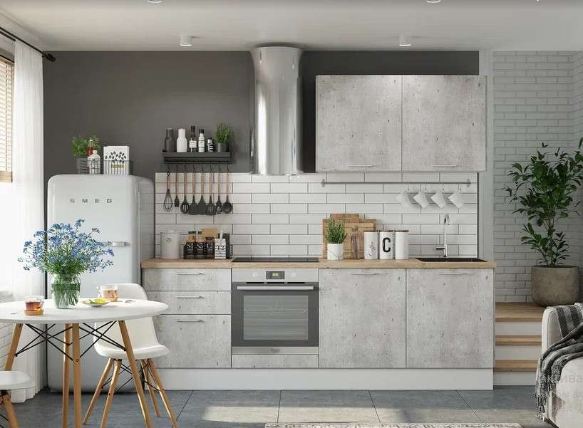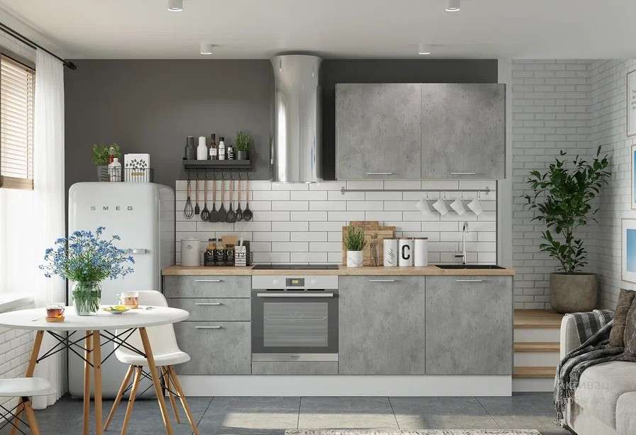 Цена указана за кухню в данной комплектации, со столешницами на каждый стол, можно заказать столешницу целиковую. На второй фото кухня в цвете Бетон Лайт, на третьей фото -Белый эмалит.