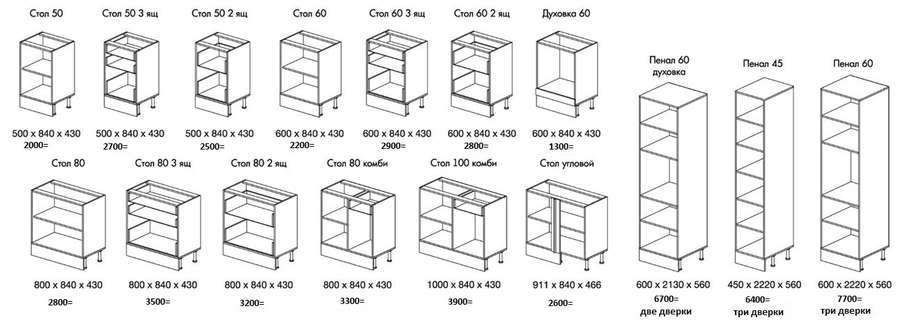 - Модули 600, 800 применяются как шкафы под глухие створки, так и под стеклостворки. Столы 50, 60 и 80 также используются как мойки.