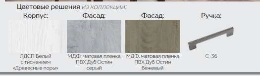 Материал: Корпус: ЛДСП Белый с тиснением «Древесные поры», Фасад МДФ Дуб Остин Серый/Дуб Остин Бежевый.