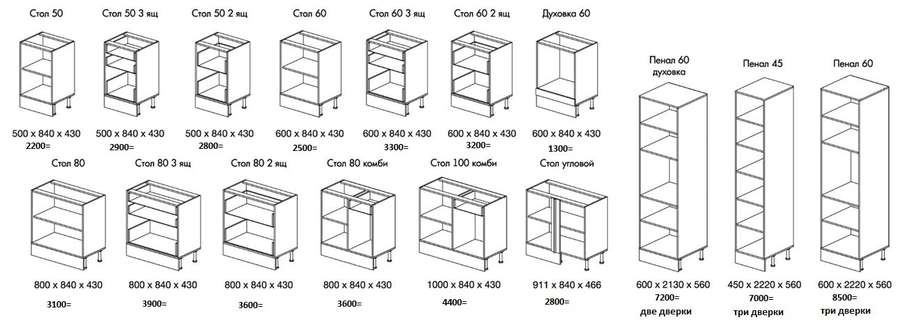 - Модули 600, 800 применяются как шкафы под глухие створки, так и под стеклостворки. Столы 50, 60 и 80 также используются как мойки.