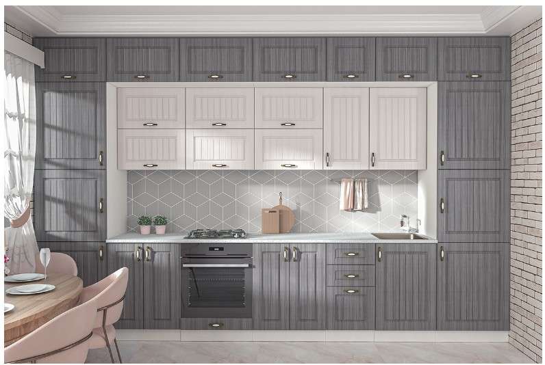 - Напольные секции: 600 Пенал (2 шт.), 600 Две створки (2 шт.), 600 Духовка, (ниша под духовой шкаф - 567х600х560 мм); 400 Три ящика, 500 Мойка.