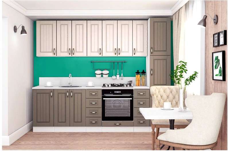Цена указана за кухню на фото размером 2,6м. В комплект "Прованс МП" (МП - матовая плёнка) входит: пять навесных секций и шесть напольных.