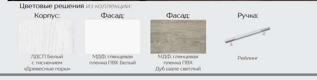 Материал: Корпус: ЛДСП Белый с тиснением «Древесные поры», Фасад МДФ глянец Белый/Белый, Ваниль/Горький шоколад, Белый/Дуб Шале светлый, Шале серебро/Дуб Шале мореный.
