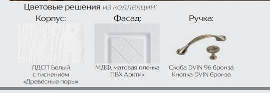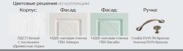 Материал: Корпус: ЛДСП Белый с тиснением «Древесные поры», Фасад МДФ Арктик/Арктик, Айвори/Васаби.