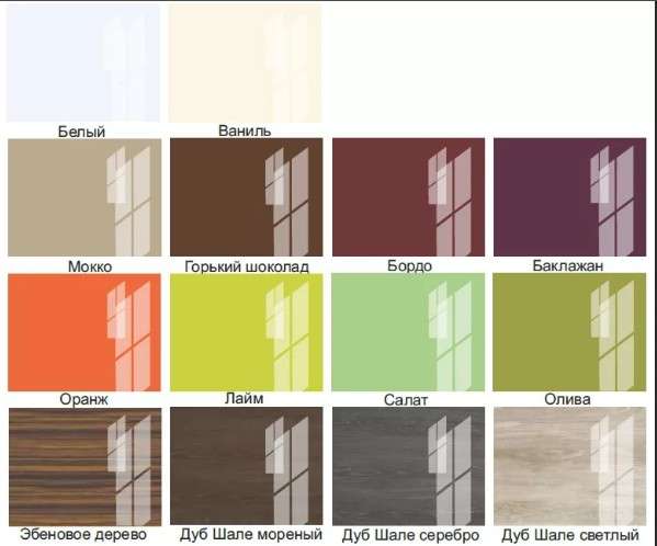 Цветовые решения: Глянец Белый, Ваниль, Мокко, Горький Шоколад, Лайм, Баклажан, Бордо, Эбеновое дерево, Шале Мореный, Шале Серебро, Шале Светлый,