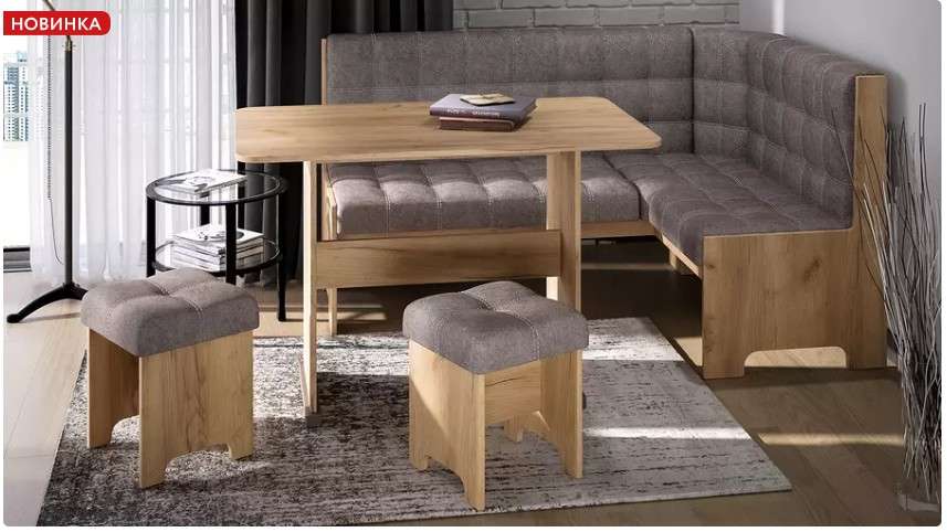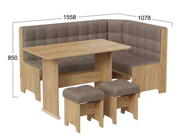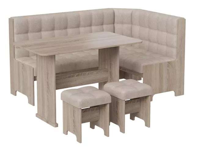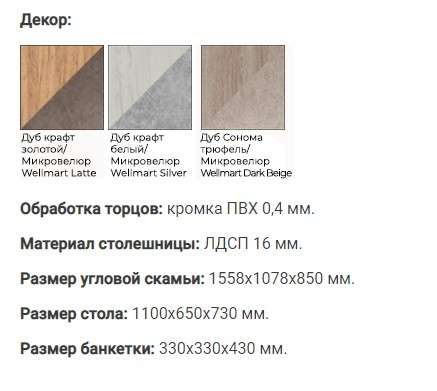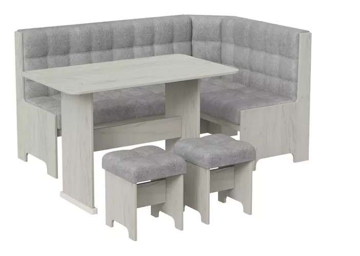 Материал: ЛДСП, Обивка Микровелюр Wellmart. В состав входят: стол, угловая скамья и два табурета.