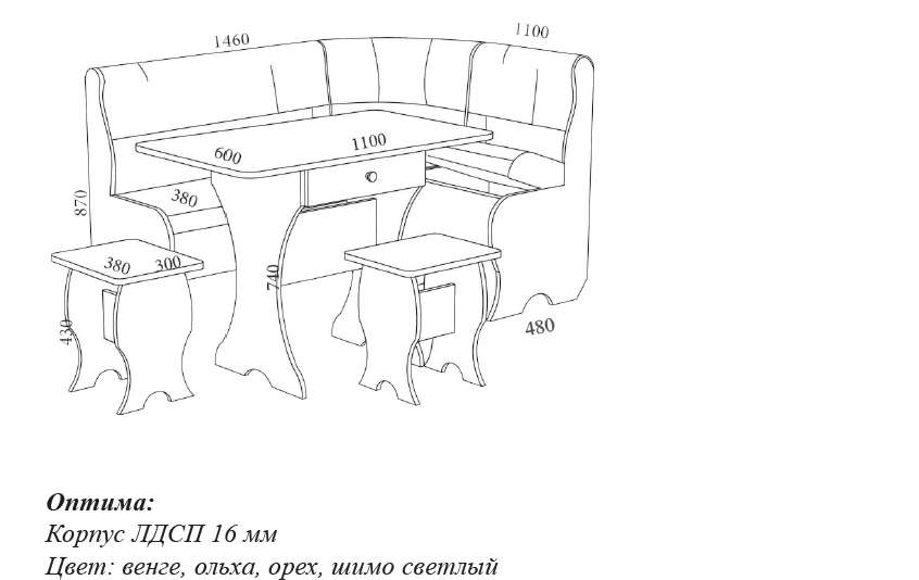 - Угловая скамья ( Имеют 2 ящика): 1460х1100х800 мм.