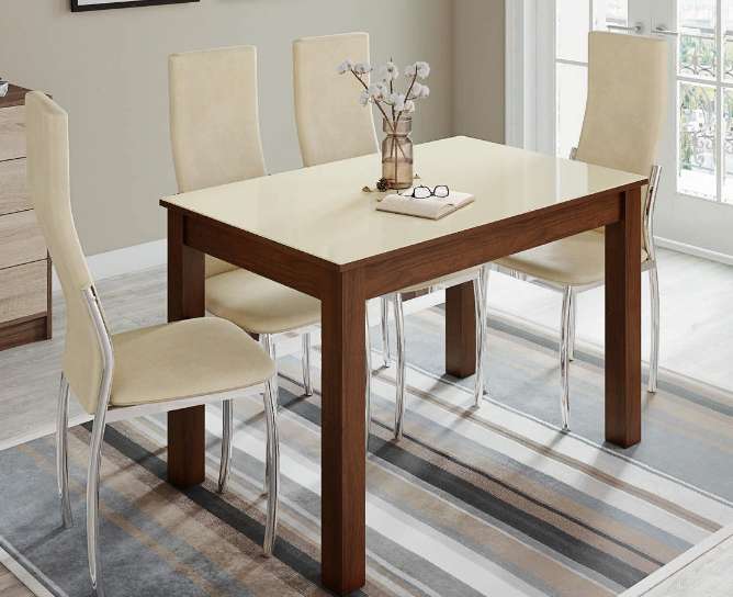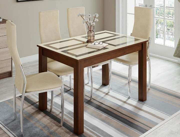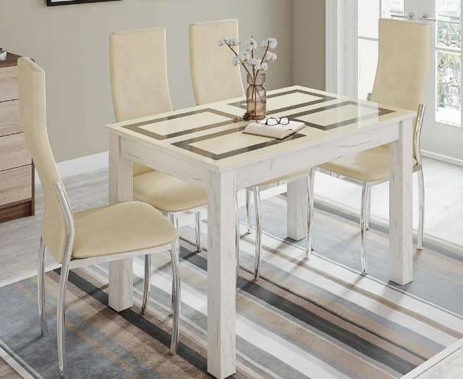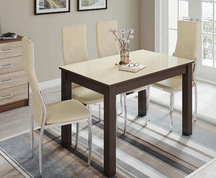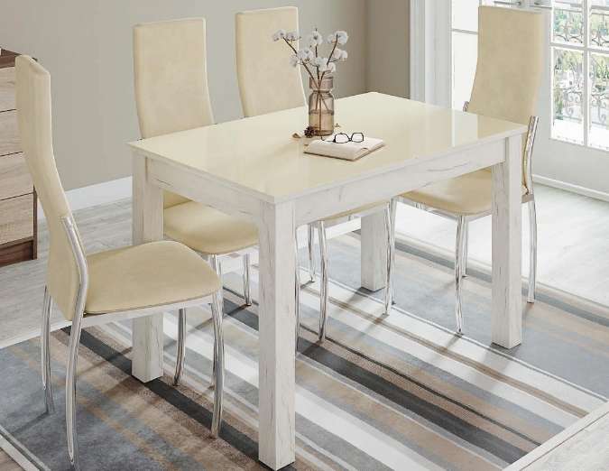 Все столешницы выполнены из ЛДСП и покрыты стеклом с нанесенным декором: Лакобель «Ваниль» или рисунок «Плитка». Столешницы имеют скруглённые углы и размерный ряд для столов Норман : 1000х600, 1100х700, 1200х800.