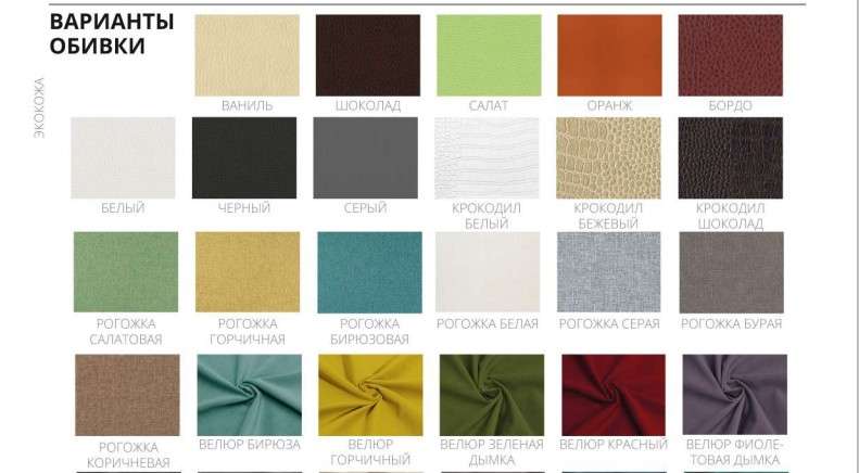 Экокожа: ⠂Ваниль ⠂Шоколад ⠂Серая ⠂Салат ⠂Бордо ⠂Белая ⠂Черная ⠂Оранж ⠂Белый крокодил ⠂Бежевый крокодил ⠂Шоколадный крокодил ⠂Комбинированная