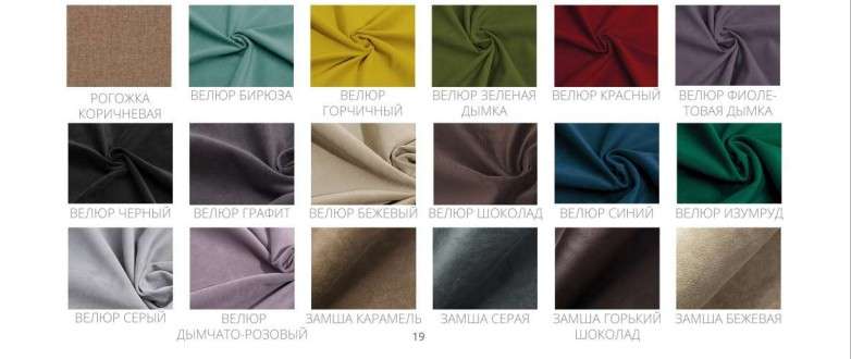 - Велюр: ⠂Бежевый ⠂Шоколад ⠂Серый ⠂Дымчато-розовый ⠂Графит ⠂Синий ⠂Изумруд.