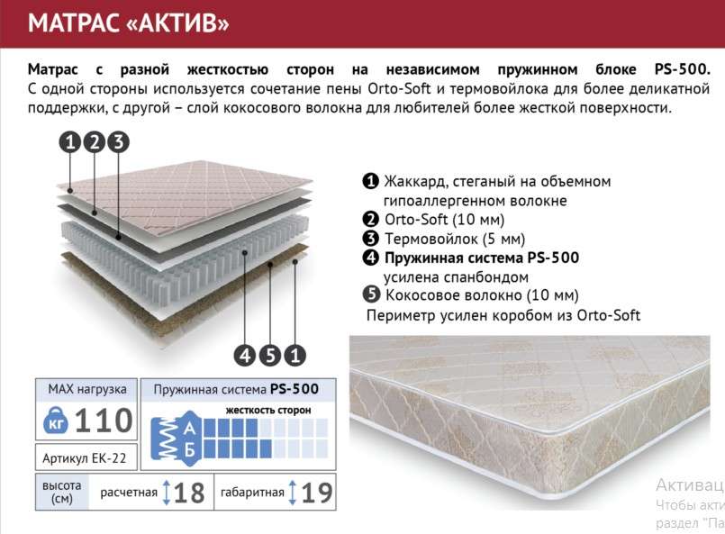 Матрас с разной жесткостью сторон на независимом пружинном блоке PS-500 (256 пружин на 1м/2) . С одной стороны используется сочетание пены Orto-Soft и Термовойлока для более деликатной поддержки, с другой - слой кокосового волокна для любителей жесткой поверхности.
