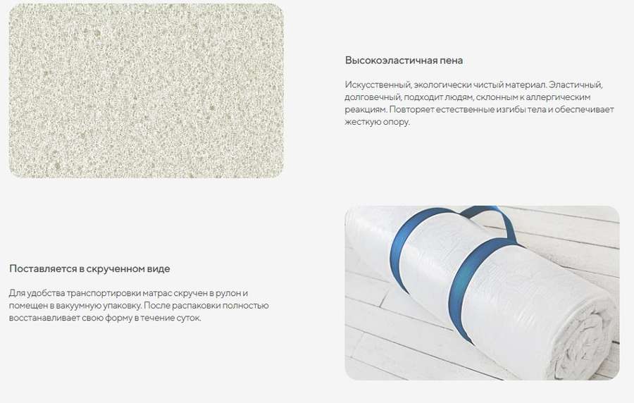 Матрас Flex Hard изготовлен на основе монолитного блока из гипоаллергенного, влагоустойчивого и долговечного материала Foam. Благодаря высокой степени упругости обеспечивает идеальный анатомический эффект. Чехол изготавливается из дышащего трикотажа, простеганного на синтепоне. Для удобства транспортировки толстый матрас Flex Hard скручен в рулон и помещен в вакуумную упаковку. После распаковки полностью восстанавливает свою форму в течение суток.