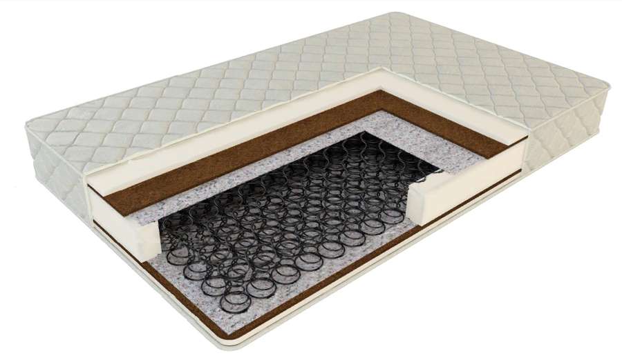Бюджетный пружинный матрас с кокосовой койрой толщиной 30 мм с каждой стороны.