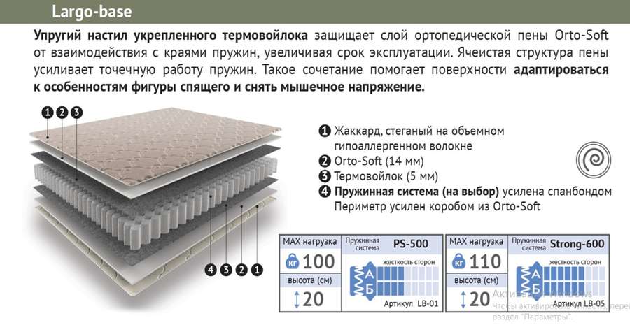 Упругий настил укрепленного термовойлока защищает слой ортопедической пены Orto-Soft от взаимодействия с краями пружин, увеличивая срок эксплуатации. Ячеистая структура пены усиливает точечную работу пружин. Такое сочетание помогает поверхности адаптироваться к особенностям фигуры спящего и снять мышечное напряжение.
