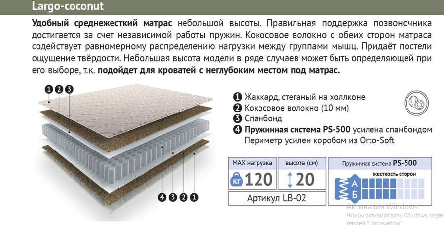 Удобный, среднежесткий матрас небольшой высоты. Правильная поддержка позвоночника достигается за счет независимой работы пружин. Кокосовое волокно с обеих сторон матраса содействует равномерному распределению нагрузки между группами мышц. Придает постели ощущение твердости. Небольшая высота модели в ряде случаев может быть определяющей при его выборе, т.к. подойдет для кроватей с неглубоким местом под матрас.