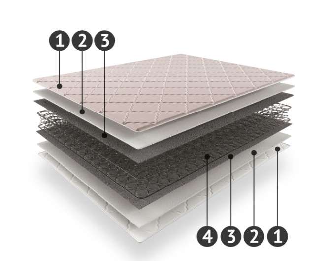 Матрас средней степени жесткости на классическом пружинном блоке Bonnell biconus 5 . Блок состоит из 5-витковых биконусных пружин, скрепленных между собой спиралью из высокоуглеродистой стали. В качестве наполнителя используется современный гипоаллергенный материал Orto-soft, приближенный по своим свойствам к натуральному латексу. Обладает высокой воздухопроницаемостью и позволяет матрасу выдерживать продолжительные нагрузки. Orto-soft наделяет модель повышенной эластичностью, позволяя подстраиваться под изгибы тела спящего, а затем быстро восстанавливаться. Термовойлок, входящий в состав матраса, экологически чистый материал, состоящий из смеси синтетических, хлопковых и шерстяных волокон. Термовойлок позволяет существенно продлить срок службы изделия и значительно повысить его эксплутационные свойства.