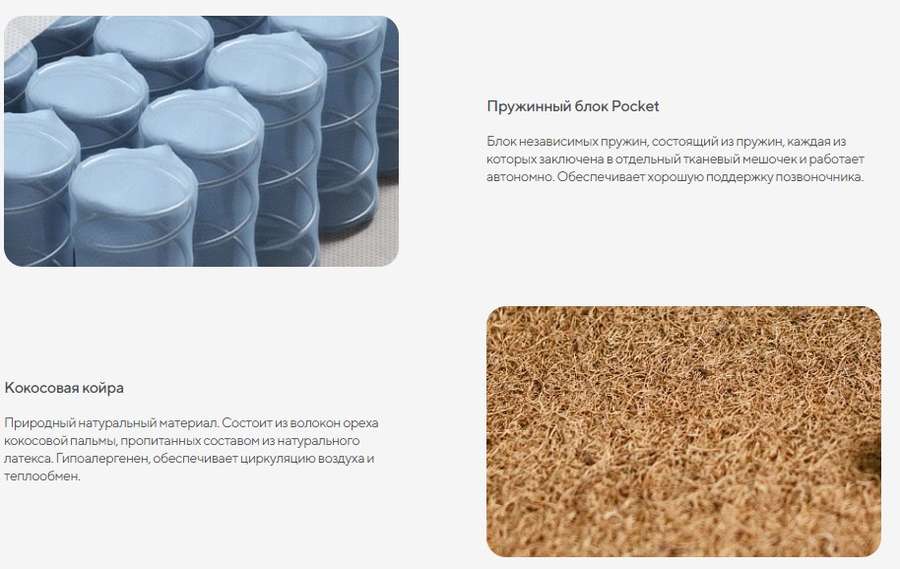 Матрас на основе блока независимых пружин Pocket, плотностью 512 пружин на спальное место, снимает нагрузку с позвоночника и качественно поддерживает область поясницы. Кокосовая койра обеспечивает оптимальную жесткость. Чехол матраса изготовлен из практичного и современного трикотажа.
