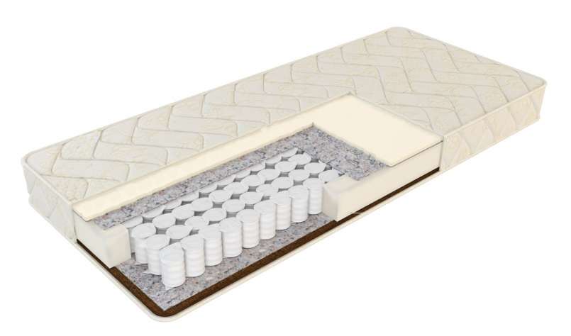 Состав: чехол: хлопковый жаккард, стеганый синтепоном , спанбонд, кокосовая койра 10 мм, войлок ,блок независимых пружин (500 пружин на спальное место) , войлок, пенополиуретан, ППУ по периметру .