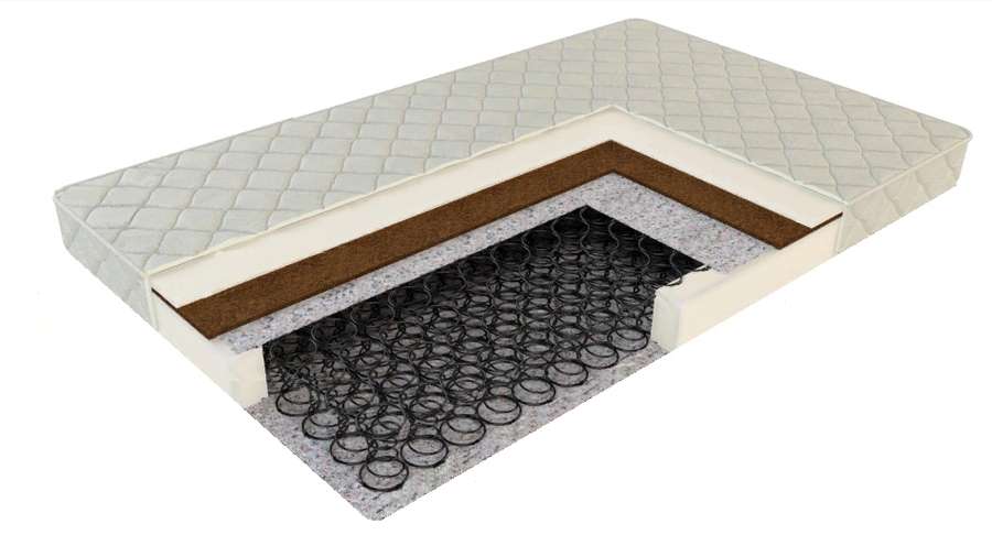 Состав: хлопковый жаккард, ППУ 15 мм, кокосовая койра 30 мм, спанбонд, усиленный зависимый блок пружин Боннель, войлок, спанбонд, ППУ по периметру.