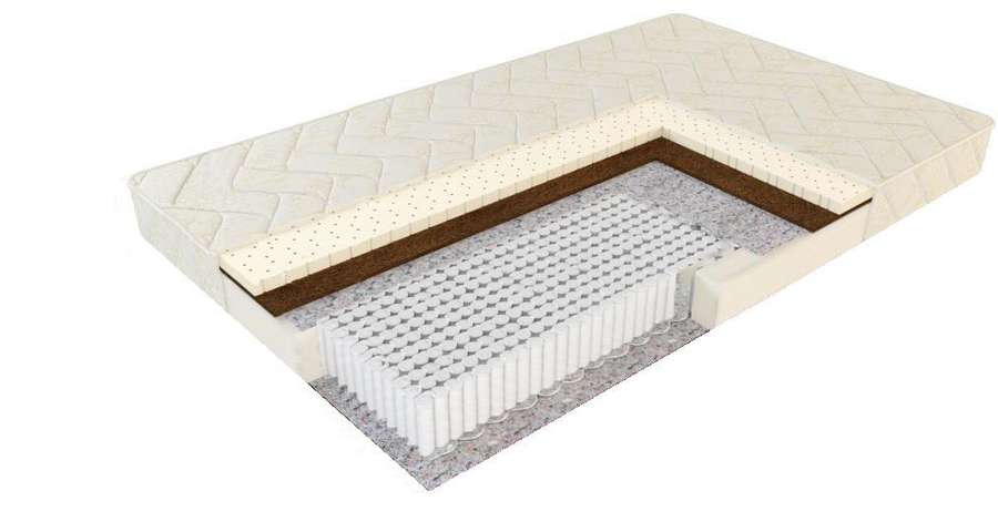 Ортопедический эффект пружинного блока Мультипакет гармонично дополняется анатомическими свойствами эластичного и упругого слоя натурального латекса и кокосовой койры.