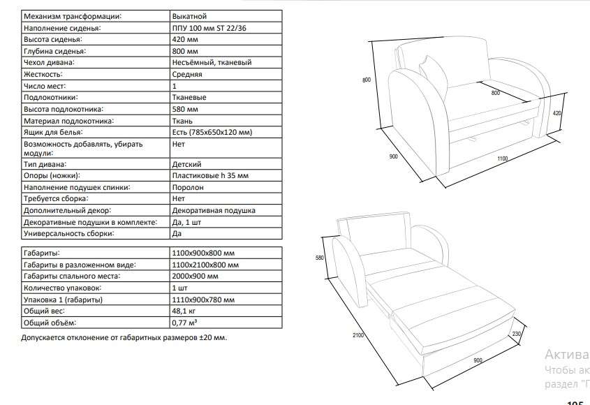 - Габариты в разложенном виде: 1100х2100х800 мм