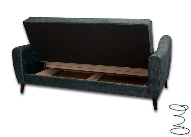 Современный внешний вид. Надежный и простой, проверенный временем механизм трансформации «книжка» предназначен для ежедневного использования. Полноценное спальное место – ровная спальная поверхность без перепадов по высоте. Несущий короб, который можно использовать в качестве ящика для белья выполнен из ЛДСП, что позволяет производить влажную уборку и исключает повреждение белья занозами. Спинка – подушки (входят в комплект) наполнены поролоновой крошкой.