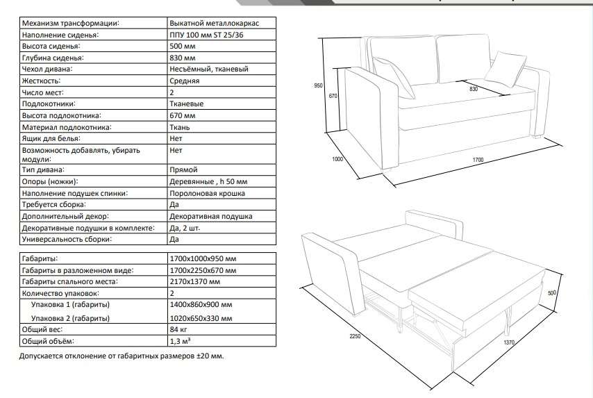 - Габариты в разложенном виде: 1700х2250х670 мм