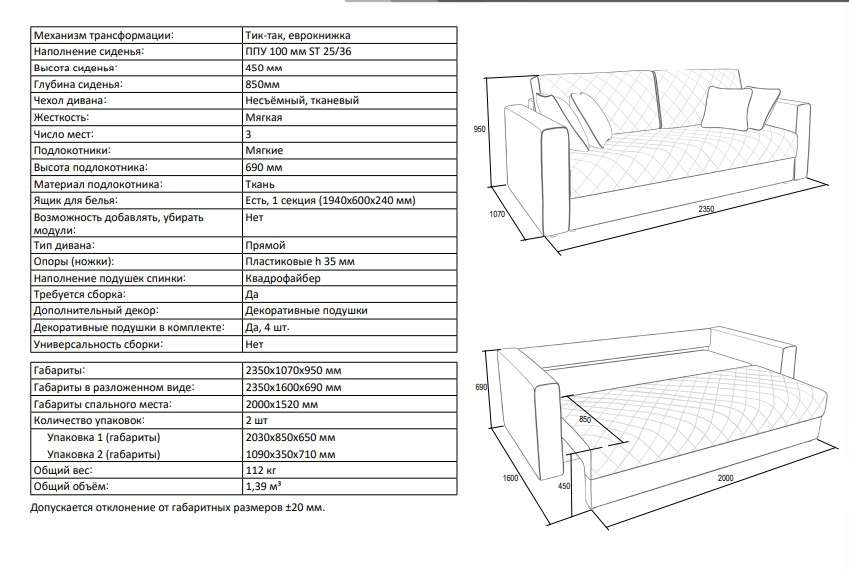 - Габариты в разложенном виде: 2350х1600х690 мм