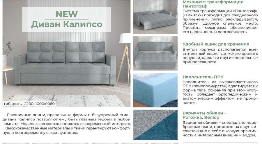 Лаконичные линии, правильные формы и безупречный стиль дивана Калипсо позволяют ему быть главным героем в любой комнате. Модель с легкостью впишется в современный интерьер.