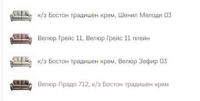 Изготавливается в тканях: к/з Бостон традишен крем, Велюр Зефир 03, к/з Бостон традишен крем, Шенил Мелоди 03, Велюр Грейс 11, Велюр Грейс 11 плейн, Велюр Прадо 712, к/з Бостон традишен крем.