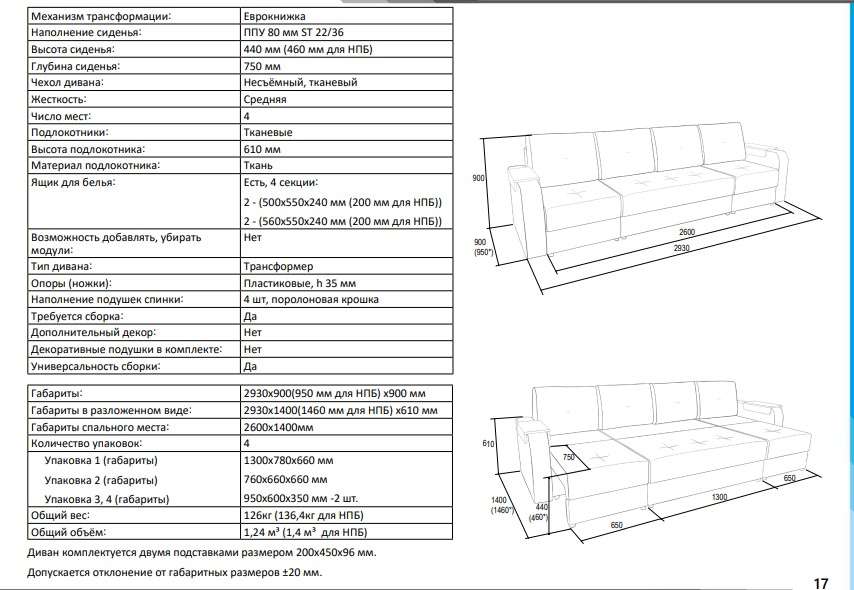 - Габариты в разложенном виде: 2930х1400(1460 мм для НПБ) х610 мм