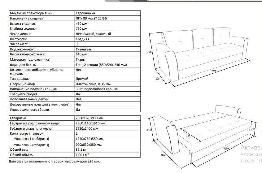 - Габариты: 2360х920х930 мм