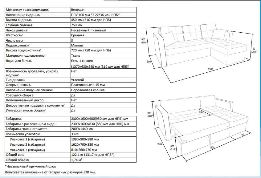 - Габариты в разложенном виде: 2300х1600х830 (880 мм для НПБ) мм