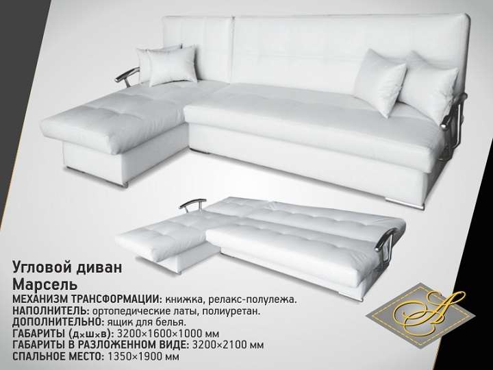 Каркас выполнен из ЛДСП. Элементы сидения и спальная часть на металлокаркасе-гнутоклееные латы(березовые),наполнитель ППУ. Опоры- металл (хром), угол правый.