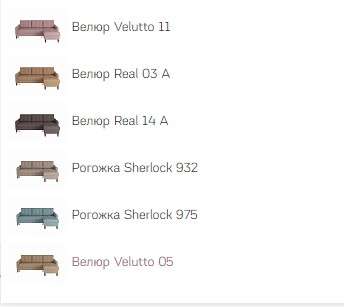 - Велюр Velutto 11, Велюр Real 03 А, Велюр Real 14 А, Рогожка Sherlock 932, Рогожка Sherlock 975, Велюр Velutto 05.