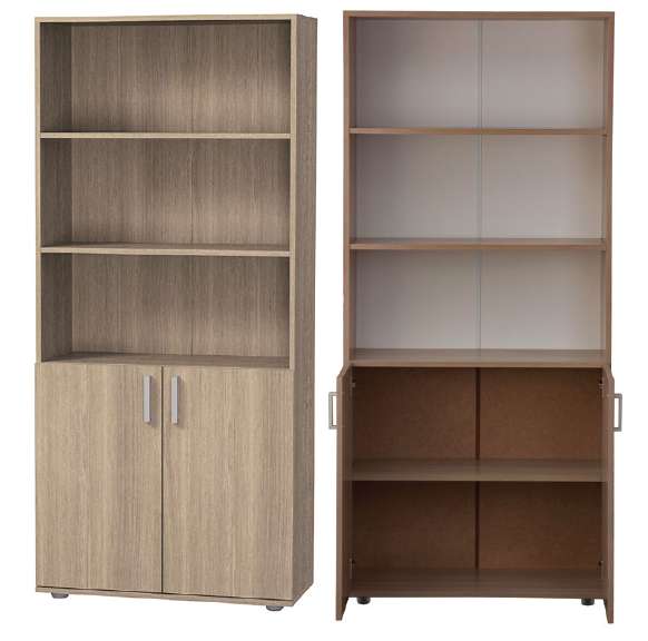 Шкаф для документов имеет 2 открытые полки и 1 полку за закрытой распашной дверкой.