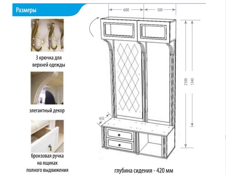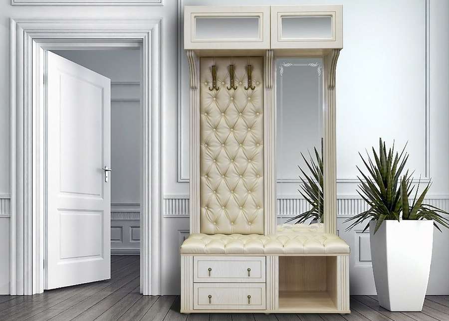 - Мягкое Сиденье и ПАННО под Вешалку декорированы каретной стяжкой из высококачественной экокожи.
