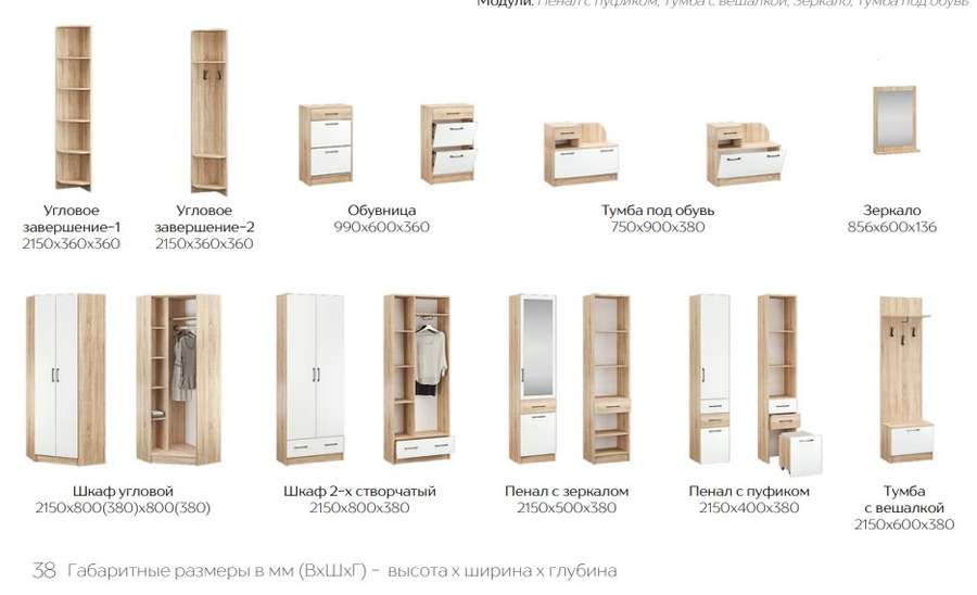 На сайте указана стоимость за комплект на первой фото: Слева на фото стоимость набора-Тумба с вешалкой, Обувница, Зеркало - 9900 руб и справа набор -Шкаф 2-х ств, Пенал с зеркалом и угловое завершение-1 - 18500 руб.