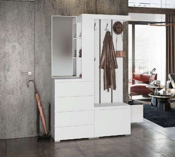 Прихожая «Хелен» это модуль коллекции, разработанной в скандинавском стиле в двух вариантах исполнения: в монохромном декоре «Белый шагрень» и в сочетании «Крафта золотого» и «Белый шагрень».