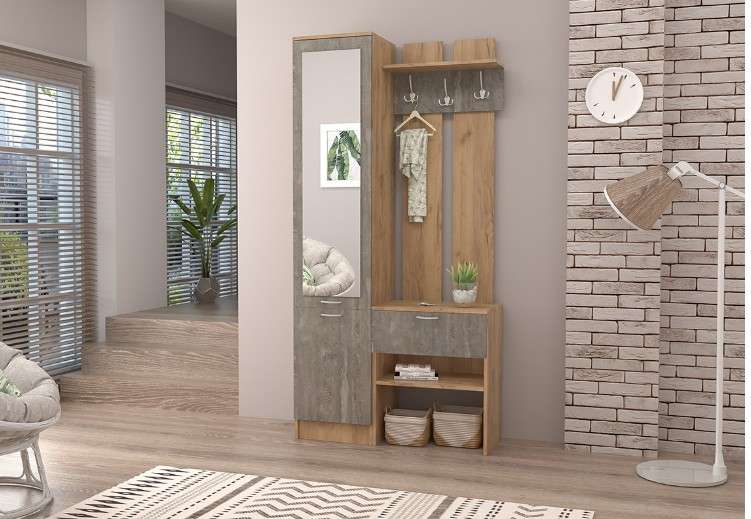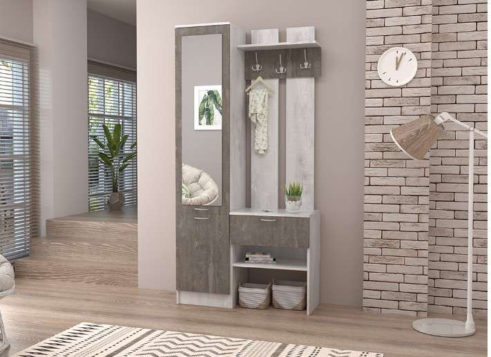 Прихожая имеет простой дизайн и прямые формы, включает пенал с зеркалом с тремя просторными полками и вешалку с тремя трёхрожковыми крючками для одежды, антресольной полкой для головных уборов, выдвижным ящиком и открытой нишей.