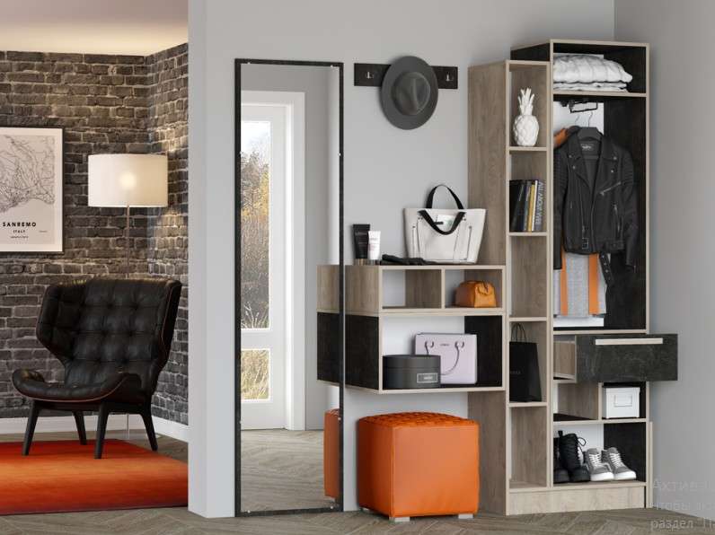 Компактная прихожая. Но в ней есть все для удобства размещения вещей и одежды: Вешалка, полочки,ящик,зеркало.