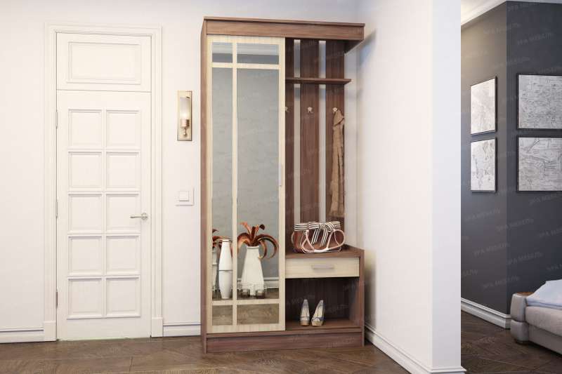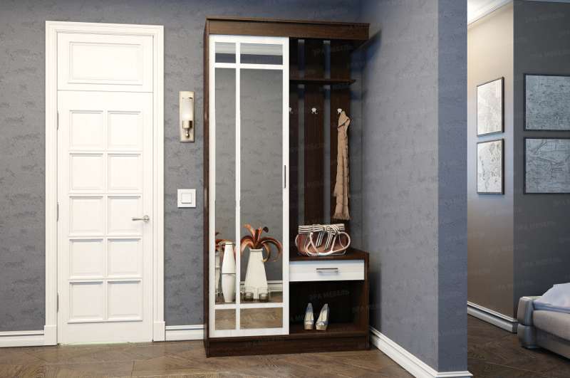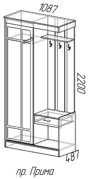 Компактная и функциональная прихожая ПРИМА (МФ ЭРА) благодаря лаконичному дизайну и небольшим размерам впишется в любой интерьер. Изюминкой прихожей является удобная дверь-купе с зеркальным фасадом. Оделение для одежды оборудовано выдвижной штангой и антресольной полкой. В прихожей имеется вешалка с крючками, полка для головных уборов, выдвижной ящик и открытая ниша для обуви под ним.