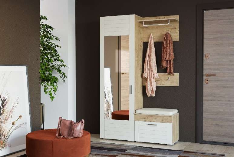 Комплектация №3 из коллекции LIVORNO – это удобство в каждой детали. Шкаф с зеркальной дверцей поможет сразу оценить свой внешний вид. Благодаря мягкому элементу тумба превращается в удобное сиденье. Комфорт во время обувания обеспечен. Комбинация двух вариантов вешалок позволит разместить сразу в одном месте не только одежду, но и аксессуары.