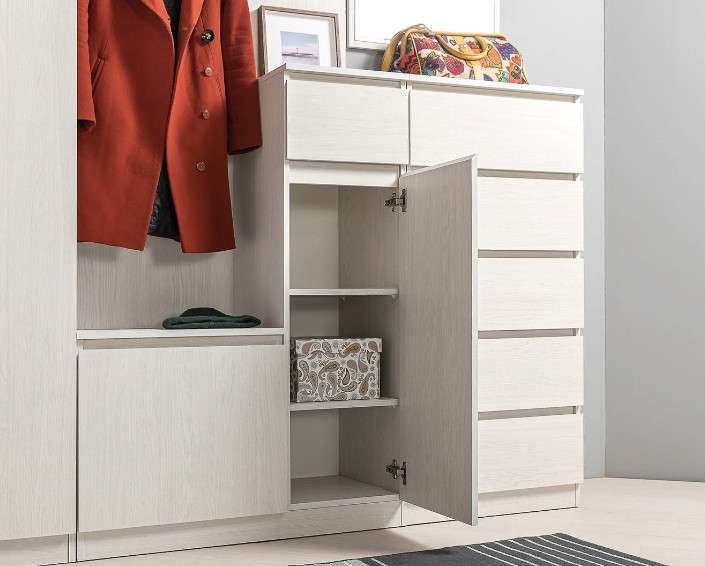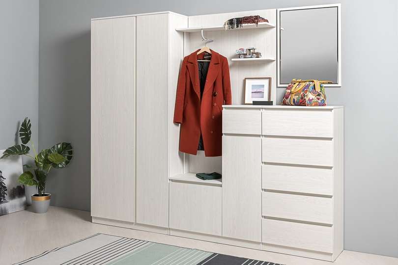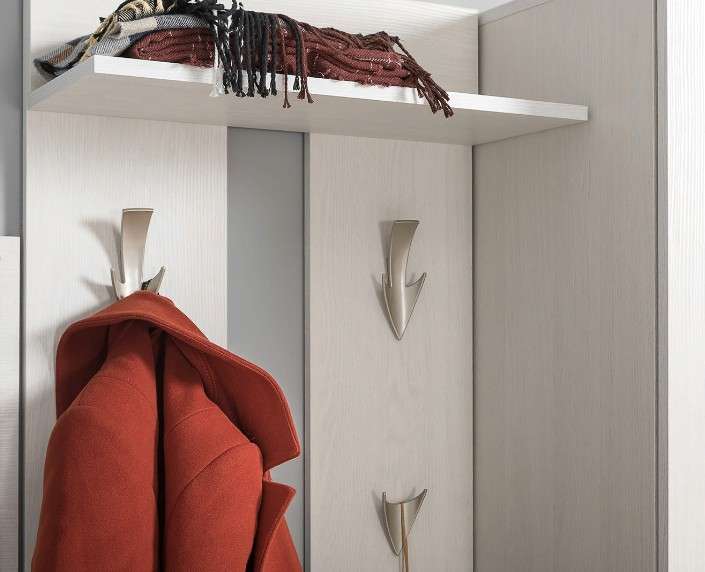 Светлая и нейтральная современная модульная прихожая. Лёгкий и ненавязчивый рисунок древесной структуры служит отличным дополнением к общему светлому тону.