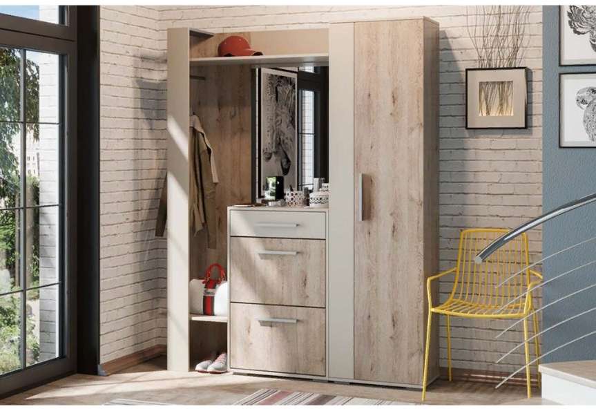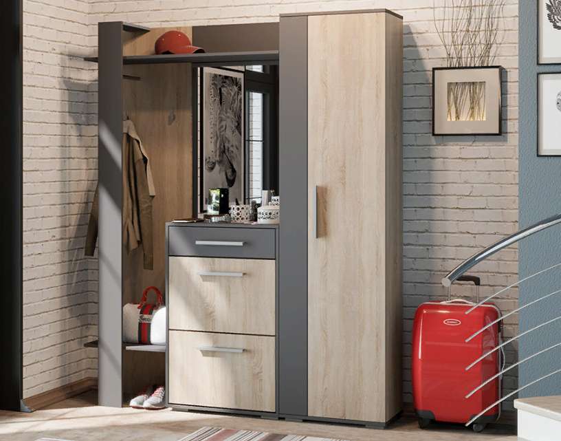 Современная прихожая включает в себя комбинированный шкаф и шкаф для одежды с выдвижной штангой.