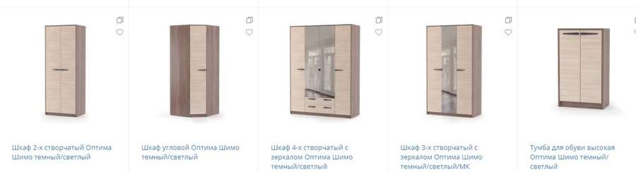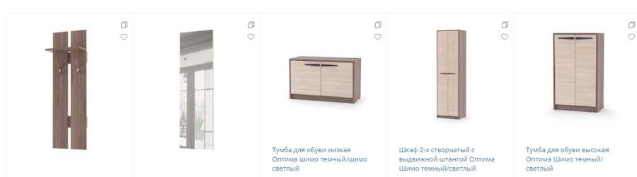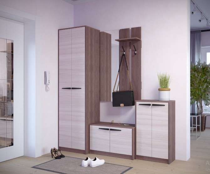 На сайте указана за комплект на фото: Шкаф 2-х створчатый с выдвижной штангой, Зеркало, Вешалка, Тумба для обуви низкая, Тумба для обуви высокая.