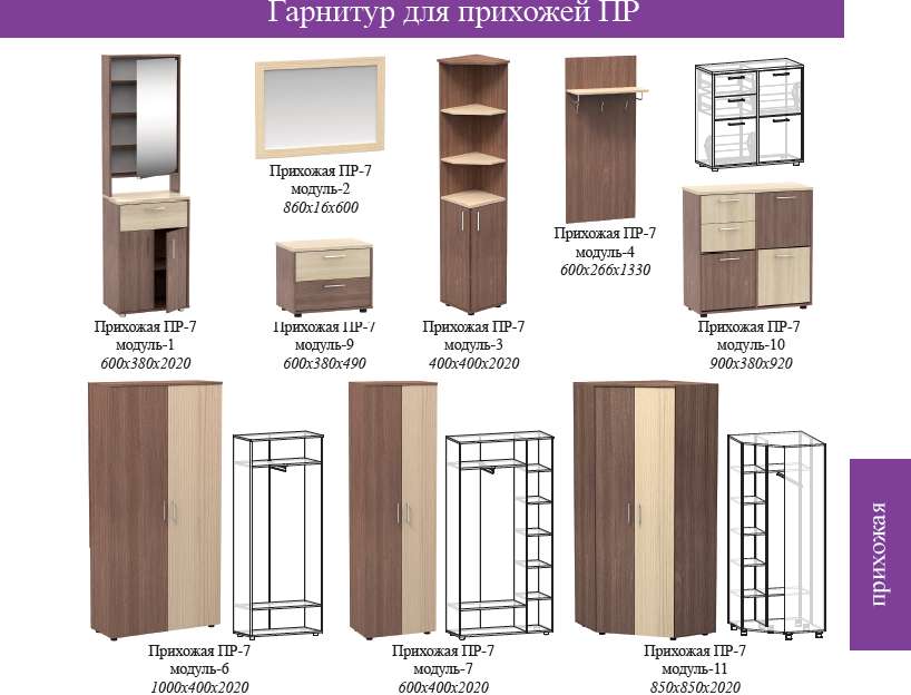 Модульная серия ПР-7 мебели для прихожей позволит вам самостоятельно подобрать композицию по вашему предпочтению.