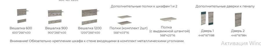 Цена на сайте указана за комплект на первой фото без комода и зеркала: Вешалка 900, Шкаф навесной 900, Тумба 900, Шкаф 1 (платяной) ,Пенал с двумя доп. дверьми.