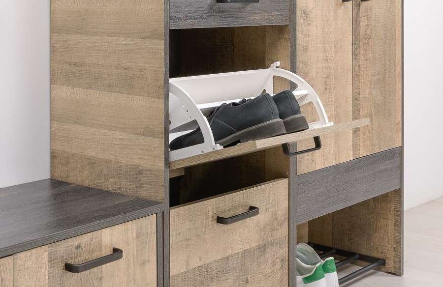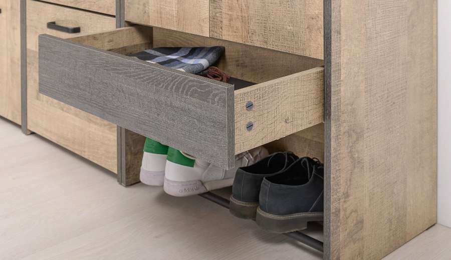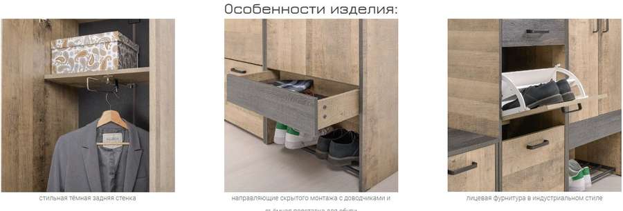 Оригинальная прихожая в стиле лофт. Скрытые направляющие и четырёхшарнирные петли оснащены доводчиками, что обеспечивают повышенный комфорт и надёжность. Металлические опоры делают эту мебель надёжной, аутентичной и функциональной. Лицевая фурнитура с тем же покрытием придаёт мебели индустриальную эстетику. Съёмная металлическая подставка для обуви значительно упрощает уборку.